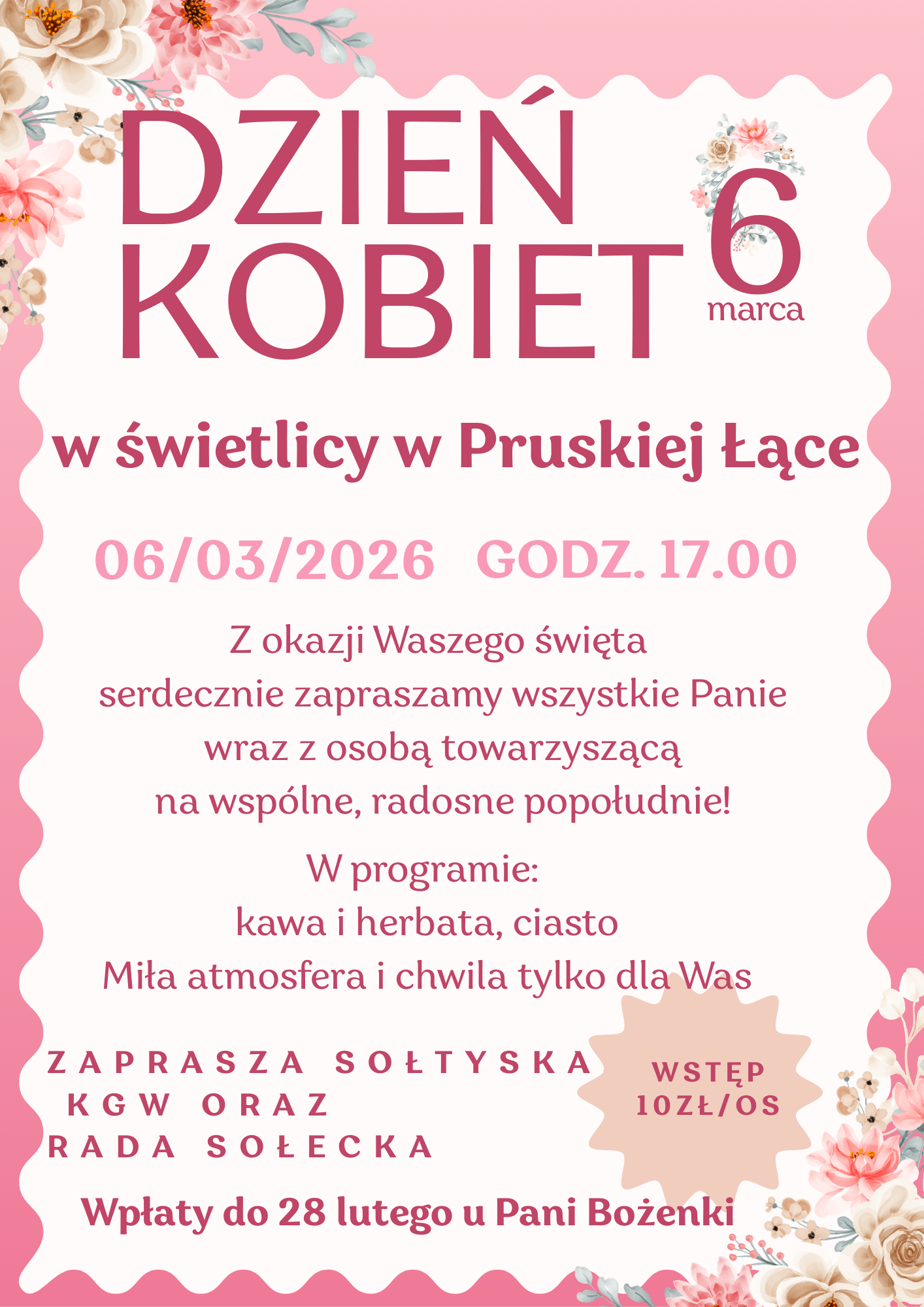 Drogie Mieszkanki Pruskiej Łąki! Koło Gospodyń Wiejskich, Rada Sołecka oraz Sołtyska serdecznie zapraszają Was na wyjątkową uroczystość z okazji Dnia Kobiet, która odbędzie się 6 marca 2025 roku (piątek) o godz. 17:00 w naszej świetlicy wiejskiej.